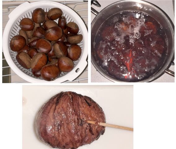 鬼皮を剥いて、重曹で灰汁を取ります